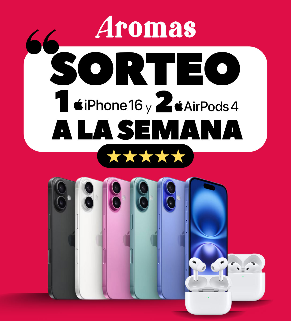 - 1iPhone16 y 2 Airpods4 a la semana durante 4 semanas. En total se sortearán 4 Iphones16 y 8 Airpods4.